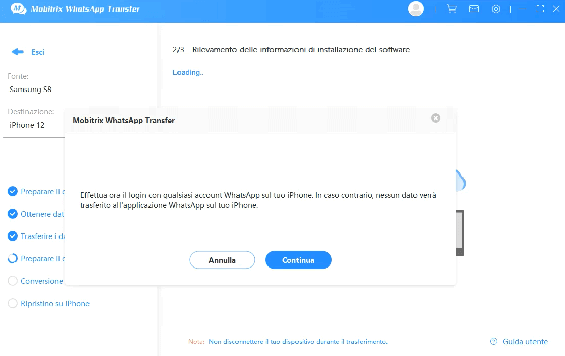 2. Modo indiretto per trasferire WhatsApp da Android a iPhonePer migliorare la coerenza durante il processo di trasferimento, ti invitiamo a utilizzare prima la funzione "Backup" sul tuo telefono Android e poi a utilizzare la funzione "Ripristina" per trasferire i dati sul tuo iPhone. In questo modo, non è necessario connettere entrambi i telefoni al PC contemporaneamente. Nota: - Devi prima accedere all'account WhatsApp sul telefono Android per il trasferimento. Durante il trasferimento, vedrai un altro messaggio che ti chiederà di accedere al tuo account WhatsApp sul tuo iPhone. Assicurati di seguire le istruzioni.